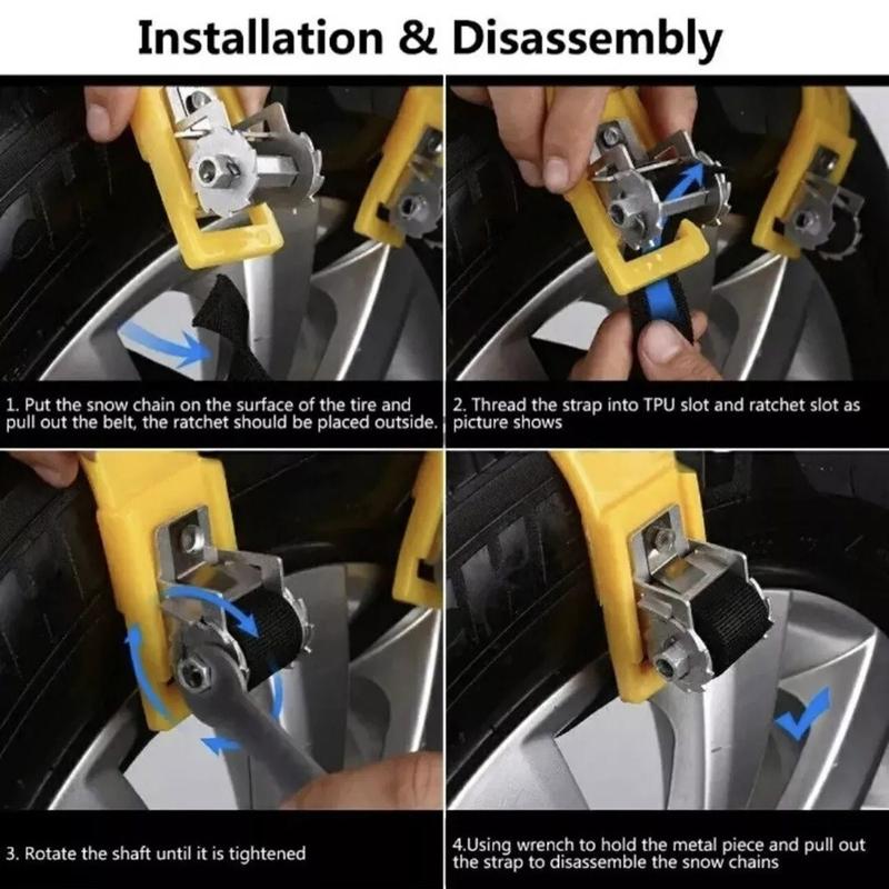 Med kugghjulsspännen och semi-intelligent fastsättning är installationen snabb och problemfri. Du kan sätta på eller ta av dem inom några minuter utan professionell hjälp, vilket gör dem praktiska för nödsituationer vid vägkanten.