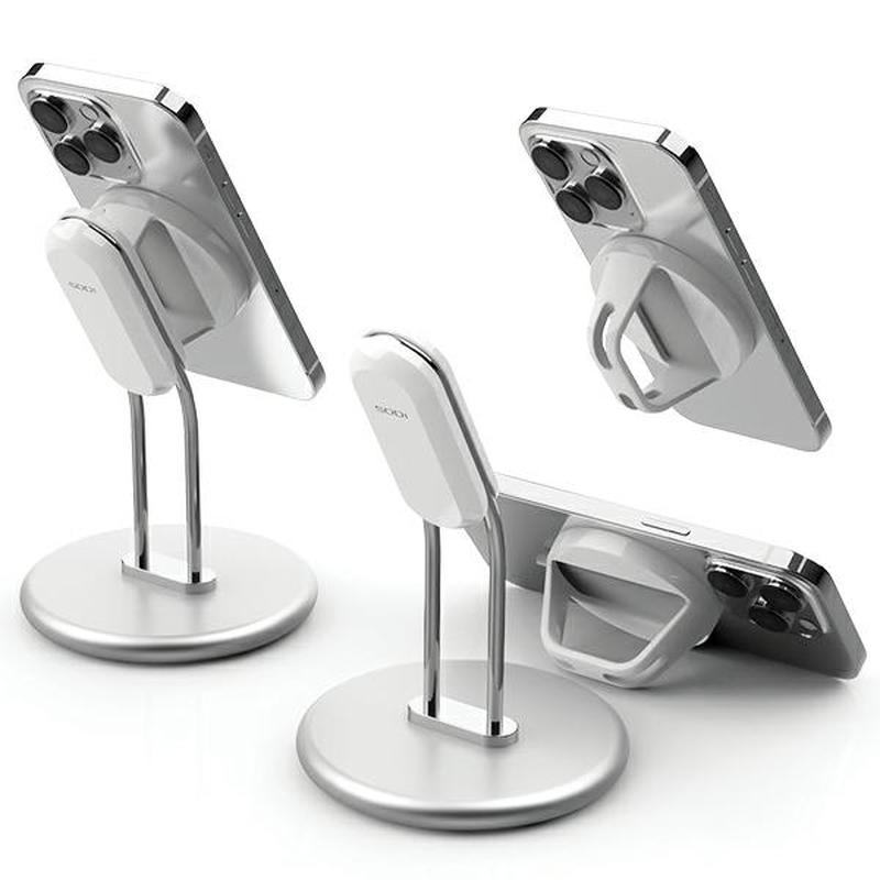 SODI SIM300 Magnetic Phone Stand har en unik design inspirerad av arkitektonisk estetik och erbjuder både funktionalitet och stil. Tillverkad av högkvalitativ aluminiumlegering och mjuka silikonkuddar ger den ett stabilt och repfritt stöd för din telefon. Stativets magnetiska hållare är löstagbar, vilket gör att den kan användas separat eller ersättas med en iPhone MagSafe trådlös laddare (ingår ej).