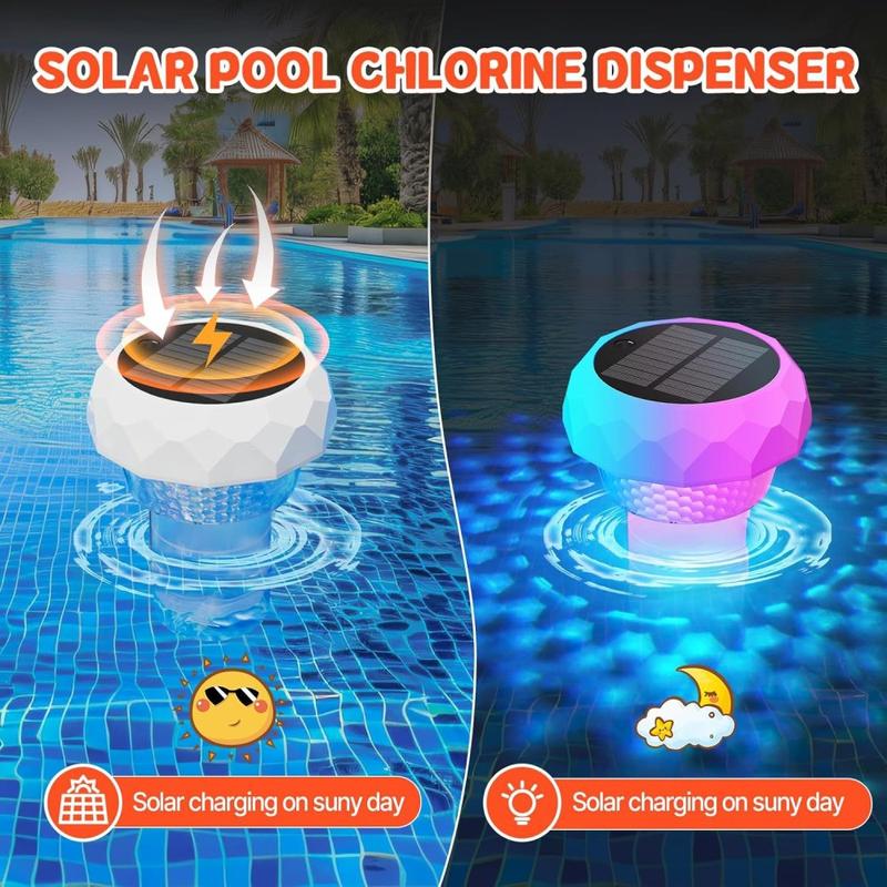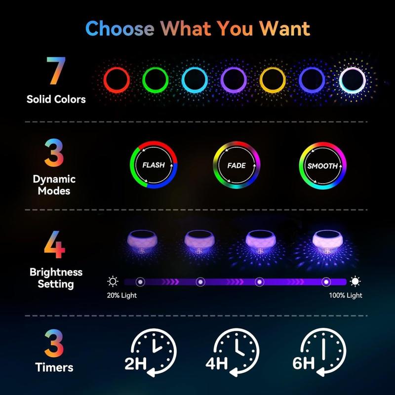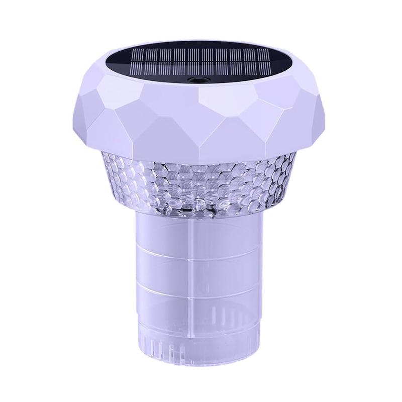 Lys upp nattliga simturer och hjälp till att hålla vattnet klarare utan kablar eller batterier. Denna soldrivna flytande lampa kombinerar en högeffektiv RGB LED-ring med en intern desinfektionsbox som arbetar tillsammans för att begränsa alg- och bakterietillväxt. En monokristallin 5 V-panel laddar litiumbatteriet på 1200 mAh i dagsljus, och lampan tänds automatiskt i skymningen för upp till tolv timmar av levande färger. Välj åtta fasta nyanser eller tre färgskiftande shower från den handhållna fjärrkontrollen och ställ in den inbyggda timern på 4, 6 eller 8 timmar - perfekt för pooler, bubbelpooler och prydnadsdammar.
