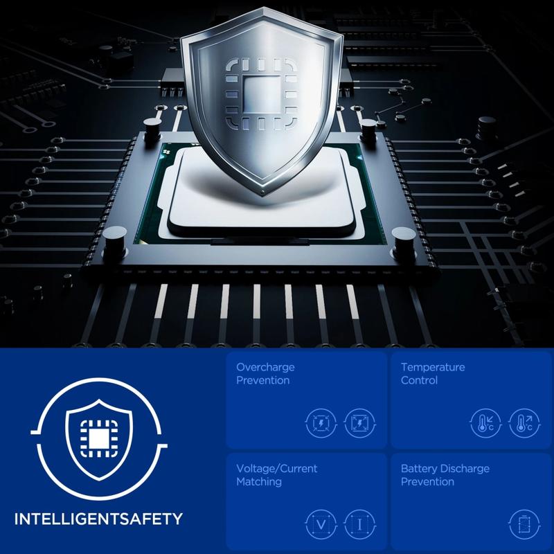 - Skydd: Överladdning, överurladdning, spänningskontroll, temperaturkontroll