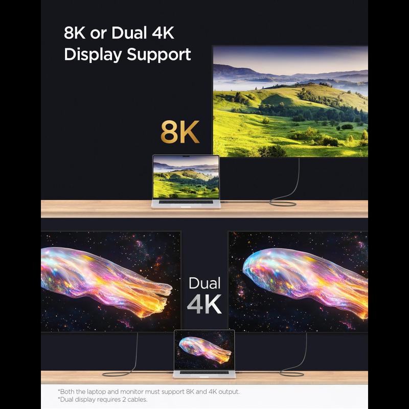 Tack vare kompatibilitet med Thunderbolt 3 och 4 stöder kabeln även avancerad videoutgång - 8K (enkel skärm) och 4K (dubbla skärmar) via DisplayPort 2.0. Detta gör den perfekt för anslutning av bärbara datorer eller dockningsstationer till högupplösta bildskärmar.