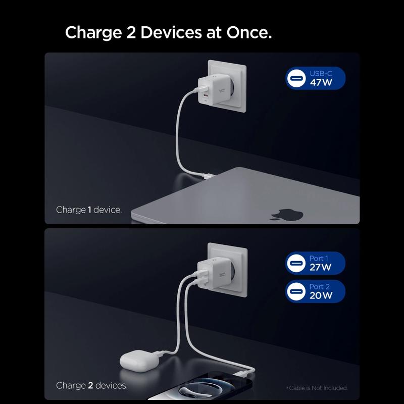 Spigen Essential EE472EU är en kraftfull och kompakt GaN Pro-väggladdare som är utformad för att snabbladda två enheter samtidigt med säker, intelligent strömhantering. Med dubbla USB-C-portar justerar den automatiskt uteffekten beroende på hur många enheter som är anslutna: en enda enhet kan dra hela 47 W från USB-C(1), medan två anslutna enheter får en effektiv delad uteffekt på 27 W + 20 W.