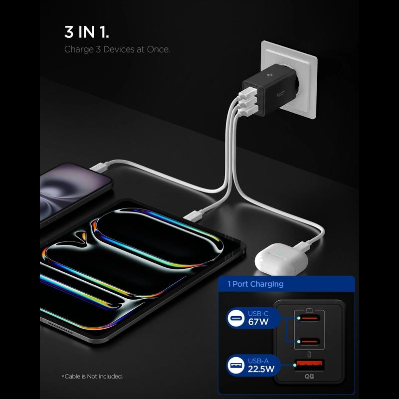 Spigen Essential EE673EU är en högpresterande GaN Pro väggladdare som är utformad för att snabbladda upp till tre enheter samtidigt. Utrustad med två USB-C-portar (upp till 67W) och en USB-A-port (22,5 W) ger den mångsidig och kraftfull laddning för smartphones, surfplattor, hörlurar, bärbara konsoler och andra USB-drivna tillbehör - allt från en kompakt adapter.