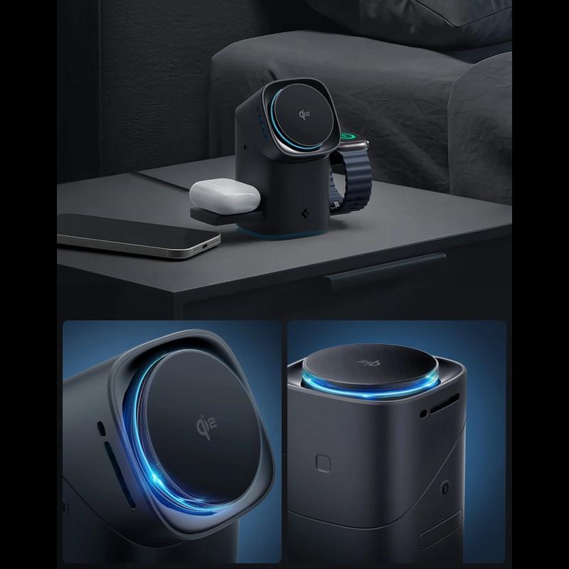 Spigen Essential EF223MS 3-i-1 Qi2 MagSafe trådlös laddare - roterande iPhone-stativ/laddare, AirPods och laddningsdocka för Apple Watch
