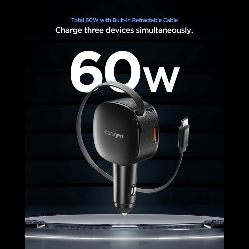 Spigen EV603BT är en kraftfull och praktisk 60 W-billaddare utrustad med 1 USB-C-port, 1 USB-A-port och en inbyggd utdragbar USB-C-kabel. Den gör att du kan ladda upp till tre enheter samtidigt, vilket gör den idealisk för familjer, pendlare och frekventa resenärer.