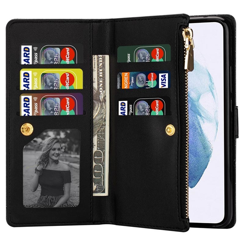 Klä in din Samsung Galaxy S22+ 5G i detta vackra plånboksfodral som är utrustat med flera praktiska fack. Detta plånboksfodral har ett stöttåligt TPU-skal på insidan som ger ett utmärkt mångsidigt skydd mot stötar och fall. Bortsett från flera kortfickor och ett fack för kontanter finns även ett fack med blixtlås som gör att du kan förvara kort, kontanter och småsaker tillsammans med mobilen. Den glittrande designen ger din Samsung Galaxy S22+ 5G en snygg och unik look, och den avtagbara snodden gör att du kan bära med mobilen på ett säkrare sätt.