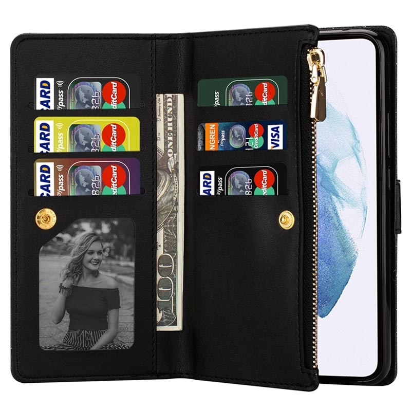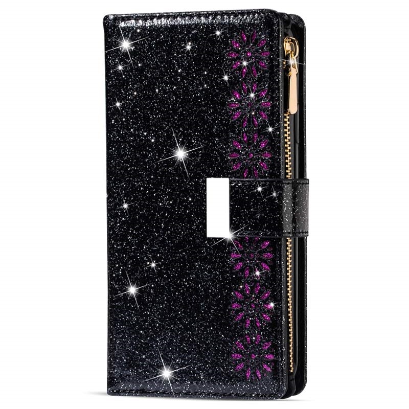 Klä in din Samsung Galaxy S22 Ultra 5G i detta vackra plånboksfodral som är utrustat med flera praktiska fack. Detta plånboksfodral har ett stöttåligt TPU-skal på insidan som ger ett utmärkt mångsidigt skydd mot stötar och fall. Bortsett från flera kortfickor och ett fack för kontanter finns även ett fack med blixtlås som gör att du kan förvara kort, kontanter och småsaker tillsammans med mobilen. Den glittrande designen ger din Samsung Galaxy S22 Ultra 5G en snygg och unik look, och den avtagbara snodden gör att du kan bära med mobilen på ett säkrare sätt.