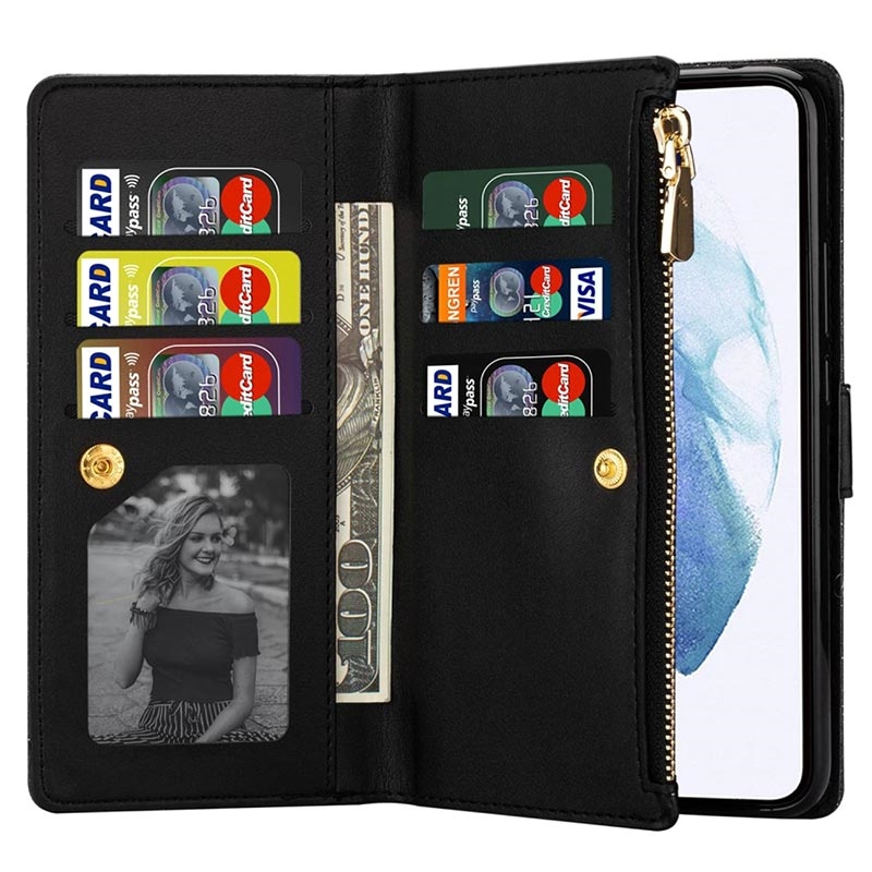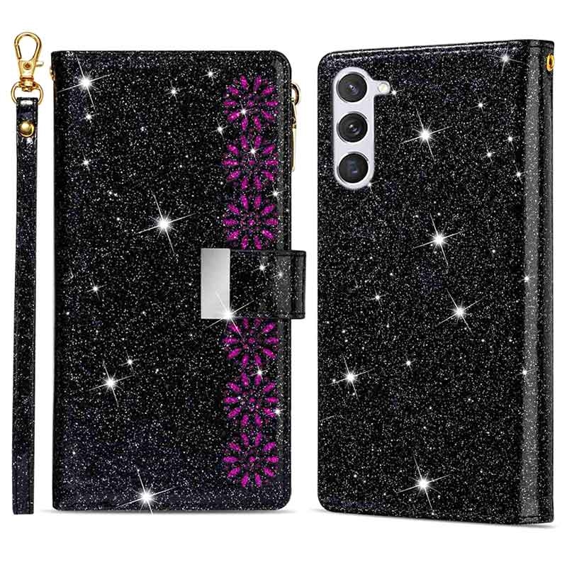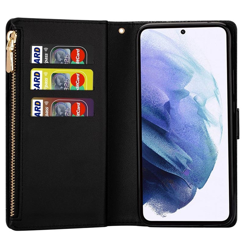 Klä in din Samsung Galaxy S23 Plus 5G i detta vackra plånboksfodral som är utrustat med flera praktiska fack. Detta plånboksfodral har ett stöttåligt TPU-skal på insidan som ger ett utmärkt mångsidigt skydd mot stötar och fall. Bortsett från flera kortfickor och ett fack för kontanter finns även ett fack med blixtlås som gör att du kan förvara kort, kontanter och småsaker tillsammans med mobilen. Den glittrande designen ger din Samsung Galaxy S23+ 5G en snygg och unik look, och den avtagbara snodden gör att du kan bära med mobilen på ett säkrare sätt.