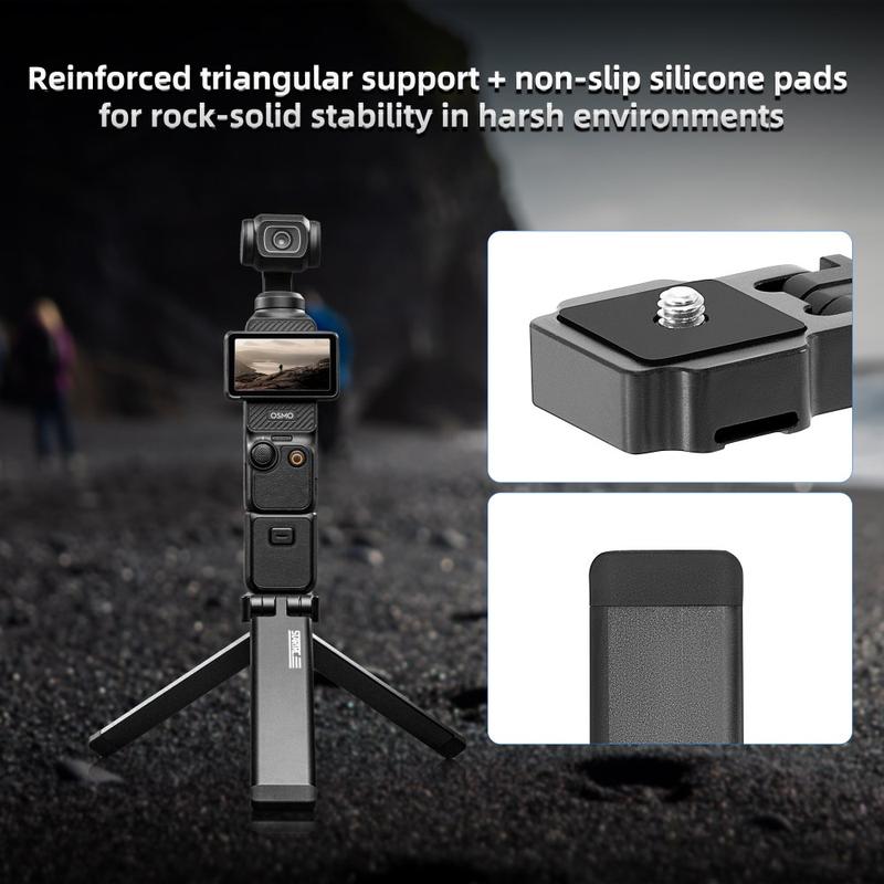 Stativet är utrustat med en standard 1/4"-gänga och är kompatibelt med ett brett utbud av enheter, inklusive DJI Pocket-serien, actionkameror, kompaktkameror och tillbehör. En GoPro-adapter medföljer för ökad mångsidighet.