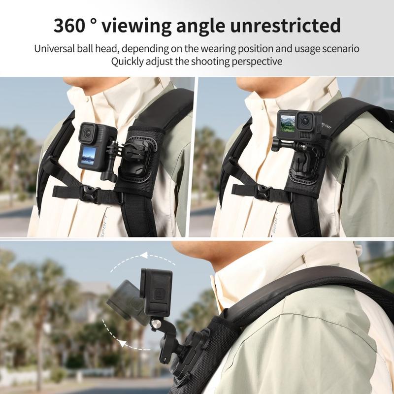 Fästet har också ett universellt kullagerhuvud för flexibel vinkeljustering, vilket gör det enklare att placera kameran för POV-bilder eller sidovinklar beroende på hur du bär ryggsäcken. Med sin lätta design, slitstarka konstruktion i nylon och fiber samt snabbkopplingsfunktion är det ett praktiskt tillbehör för kreatörer och friluftsmänniskor som vill ha enklare mobil filmning.