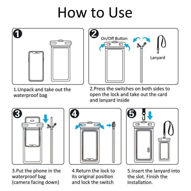 IPX8 vattentät, nedsänkbar till 30 meters djup i 0,5 timmar, perfekt för pooler, stränder, fiske, simning, segling, skidåkning, båtliv, kajakpaddling, snorkling, tubing, forsränning, dusch, bastu och andra vattenparksaktiviteter, håll din telefon och plånbok helt torr och säker
