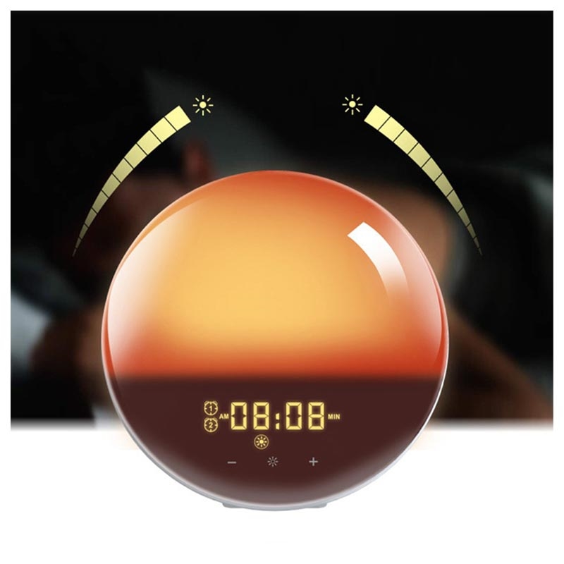 Sömnhjälpfunktion: simulerat solnedgångsljus som hjälper till att sova; musik som hjälper till att sova, inbyggd 8 sorters naturlig musik med vitt brus, du kan också välja FM-radioljudkanal som sömnmusik