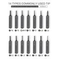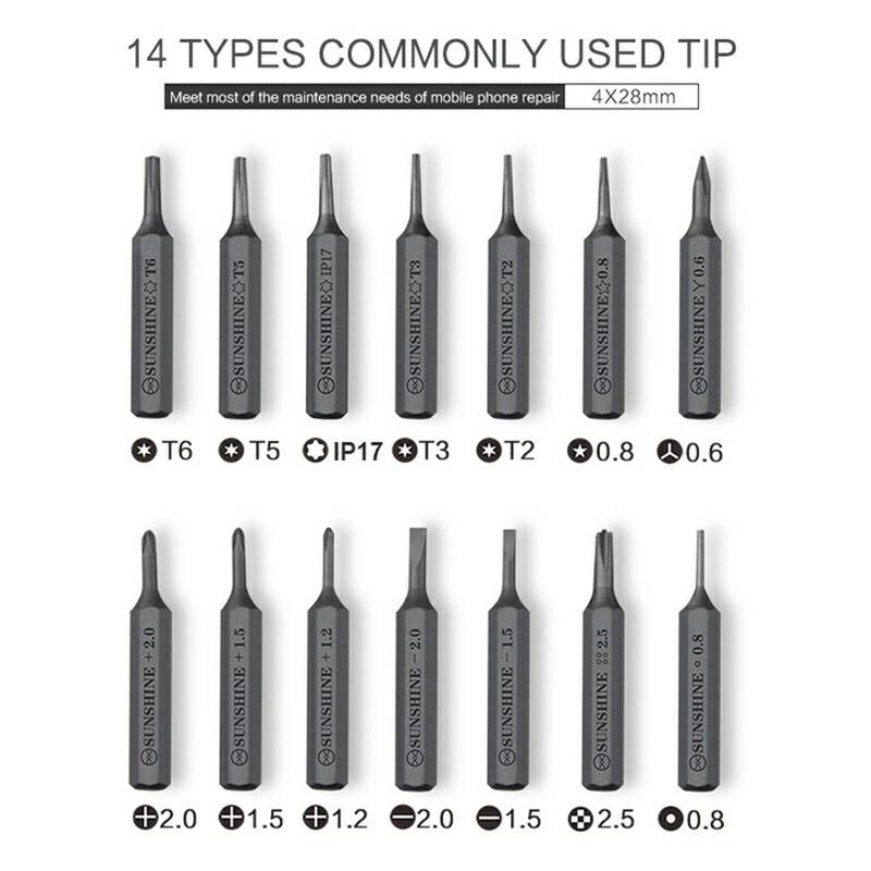 - Bitsorterna inkluderar Phillips, Flathead, Torx, Y-typ och Hex