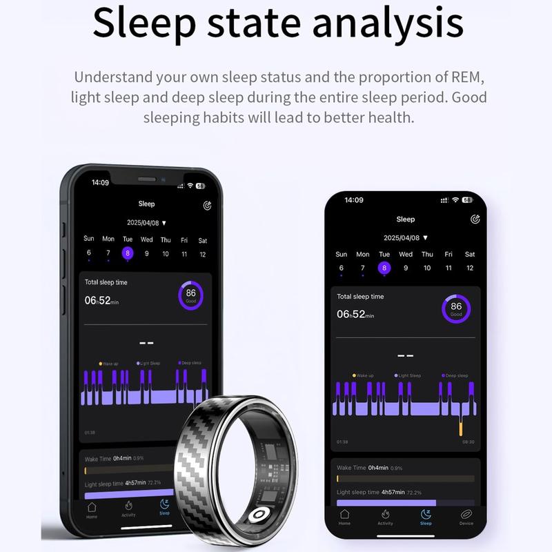 Sätt avancerad hälsoteknik på ditt finger. SY02 Smart Ring kombinerar ett elegant kolfibermönster med sensorer av medicinsk kvalitet för att spåra blodets syremättnad (SpO2), kontinuerlig hjärtfrekvensutveckling och djupgående sömnstadier - 24 timmar om dygnet, även under vatten. Ett laddningsfodral i fickformat ger hela 5 dagars normal användning från en enda 1-timmes uppladdning, medan smarta gestkontroller låter dig skrolla sociala flöden eller ta bilder utan att röra telefonen. Lättviktigt rostfritt stål (≈ 4 g / 0,004 kg) och en gelfylld insida gör den så bekväm att du glömmer att du bär den - men ändå kraftfull nog att hålla dig informerad, motiverad och uppkopplad.
