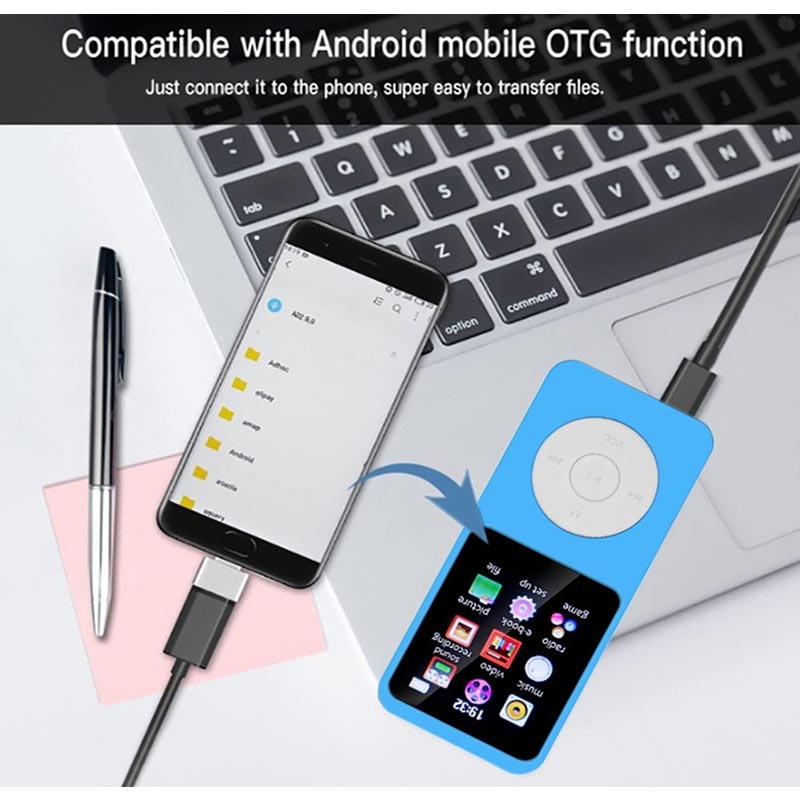 Den 1.8-tums skärmen hjälper dig att enkelt bläddra bland låtar och inställningar, och Bluetooth 5.0 låter dig ansluta till kompatibla trådlösa hörlurar eller högtalare för kabelfri lyssning. Lagringsutrymmet är också flexibelt: ett 64GB TF-kort ingår, och spelaren stöder TF-expansion upp till 128 GB, vilket ger dig gott om utrymme för låtar, ljudböcker och filer. Ladda via 5V/1A-ingång och fortsätt lyssna snabbt med en laddningstid på cirka 2 timmar.