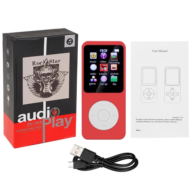 Den 1.8-tums skärmen hjälper dig att enkelt bläddra bland låtar och inställningar, och Bluetooth 5.0 låter dig ansluta till kompatibla trådlösa hörlurar eller högtalare för kabelfri lyssning. Lagringsutrymmet är också flexibelt: ett 64GB TF-kort ingår, och spelaren stöder TF-expansion upp till 128 GB, vilket ger dig gott om utrymme för låtar, ljudböcker och filer. Ladda via 5V/1A-ingång och fortsätt lyssna snabbt med en laddningstid på cirka 2 timmar.