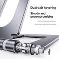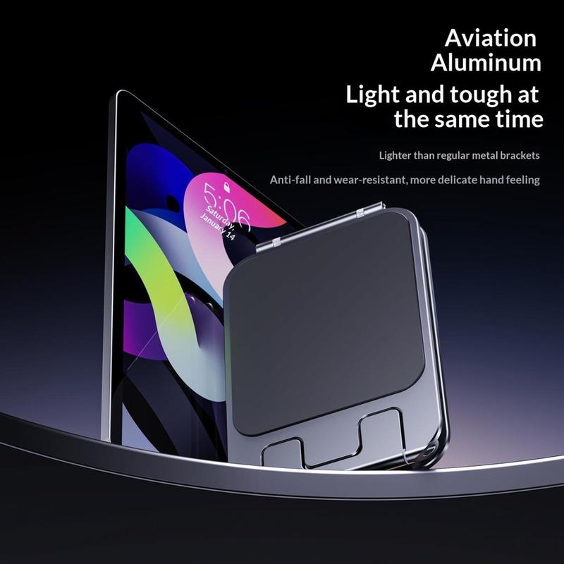 Detta stativ är tillverkat av högkvalitativ aluminiumlegering och kombinerar hållbarhet med ett rent, modernt utseende. Den robusta konstruktionen ger stabilt stöd för din enhet, medan halkskydd av silikon skyddar den mot repor och minskar oönskade rörelser under användning. Detta gör det särskilt användbart på skrivbord, bord och andra plana ytor där en stabil placering är viktig.