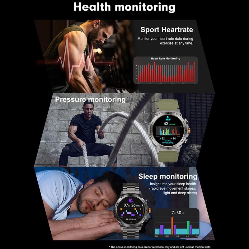 - Hälsospårning: övervakning av hjärtfrekvens, blodtryck och SpO2 för dagliga insikter