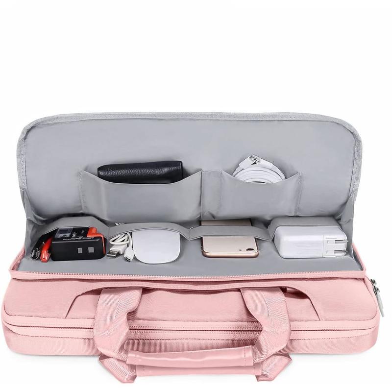 - Rymlig och organiserad förvaring: Har ett stort huvudfack för din bärbara dator, en ficka med dragkedja framtill för laddare, kablar och nycklar samt invändiga avdelare för att organisera dokument och andra viktiga saker.