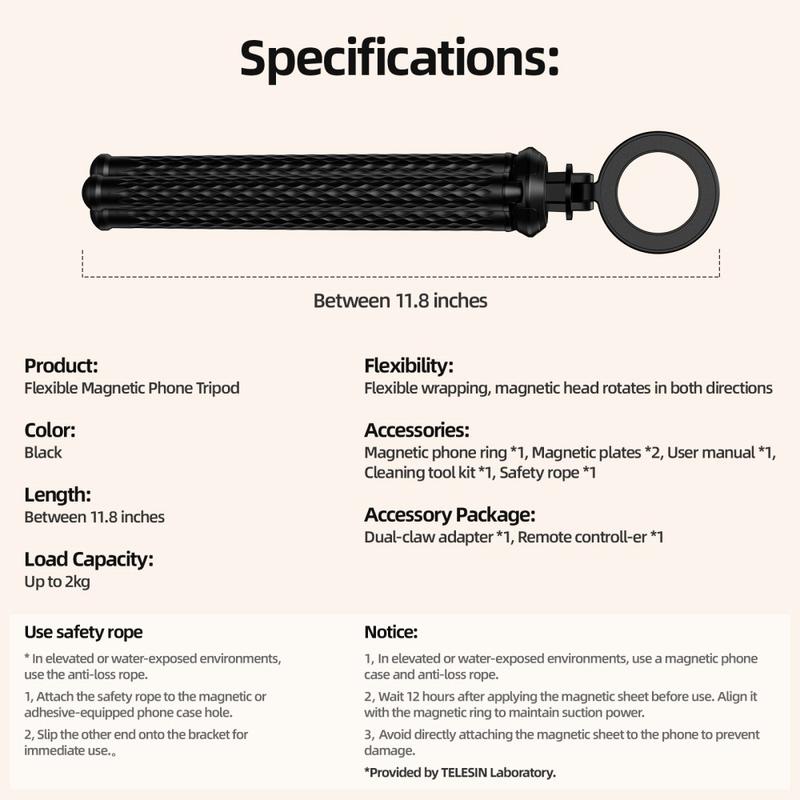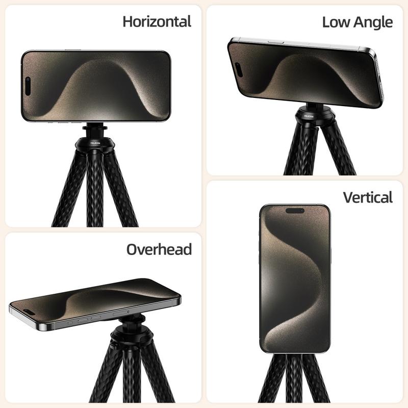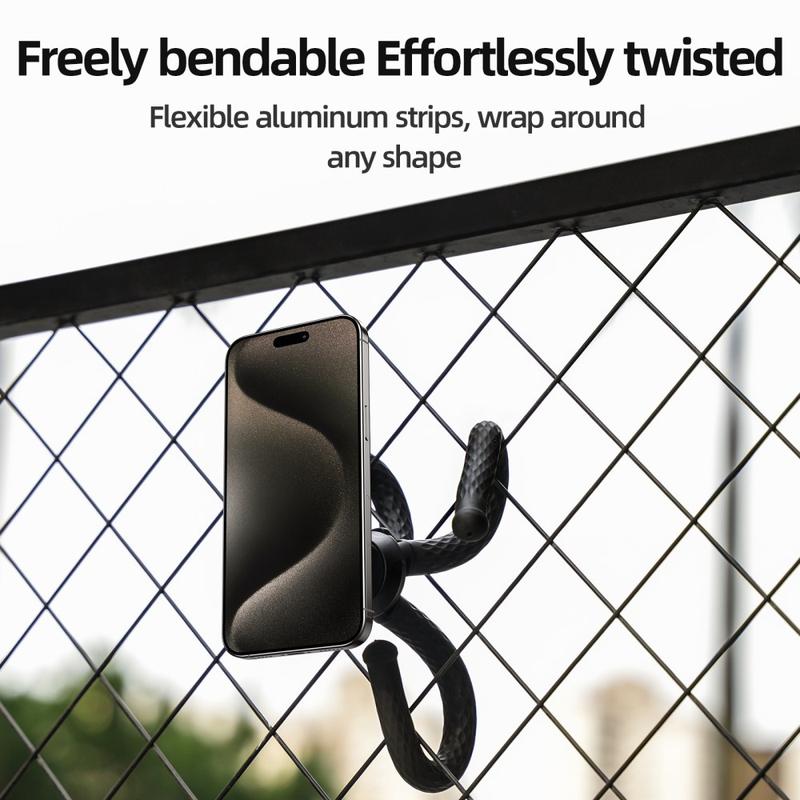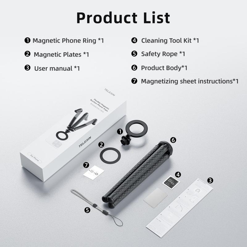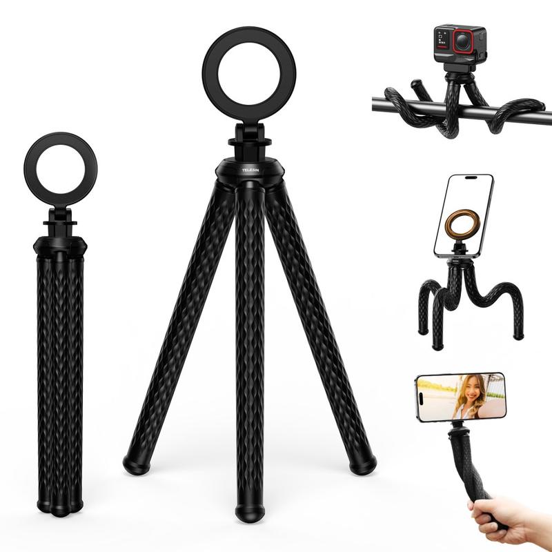 Snäpp på och fotografera var som helst. TELESIN P3-FM-02 kombinerar ett MagSafe-kompatibelt magnetiskt ringfäste med mjuka, silikonklädda aluminiumben som du kan böja runt skenor, balansera på skrivbord eller jämna ut på ojämn mark. En friktionsled justerar betraktningsvinkeln, medan den utbytbara 1/4"-gängan gör att du kan byta ut actionkameror, kompaktljus eller andra tillbehör på några sekunder.
