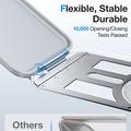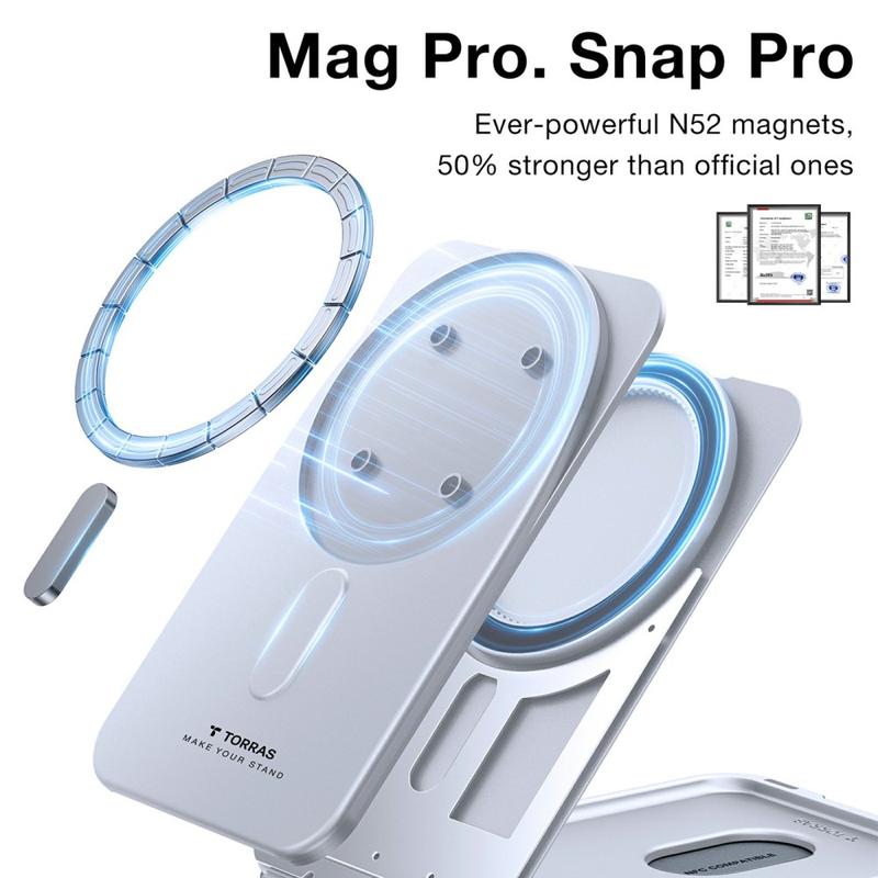 I stället för att bära med dig ett separat stativ, grepp och korthållare får du tre funktioner i ett enda tillbehör på 40 gram som klickas på eller av på en sekund. Det förstärkta gångjärnet och N52-magneterna innebär färre fall, snabbare betalningar och renare skrivbord - allt medan du behåller din telefons smala silhuett.