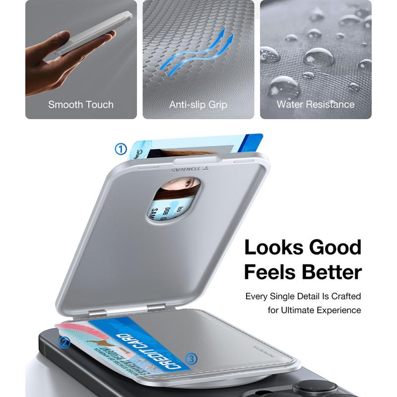 Fäst den här tunna plånboken i veganläder på baksidan av alla MagSafe-klara telefoner och du får omedelbart en säker ficka för tre kort, ett 360° roterbart kick-stativ för handsfree-visning och ett stadigt fingergrepp. Ultrastarka N52-magneter håller plånboken låst på plats även när du skyndar dig till tåget, medan en anti-degaussing liner skyddar betalkort från skador på magnetremsan.