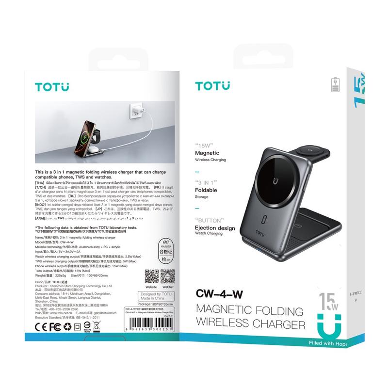 TOTU CW-4-W eliminerar behovet av flera laddare genom att kombinera alla dina väsentligheter i en enhet. Dess kompakta, vikbara design gör den idealisk för resor, medan snabb trådlös laddning säkerställer att du inte behöver vänta. Premium byggkvalitet garanterar hållbarhet och stil, vilket gör den till ett pålitligt val för moderna användare.