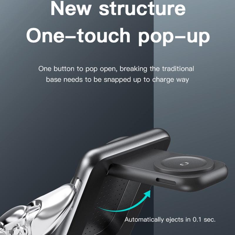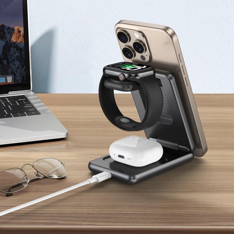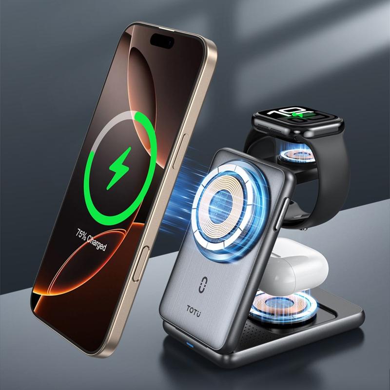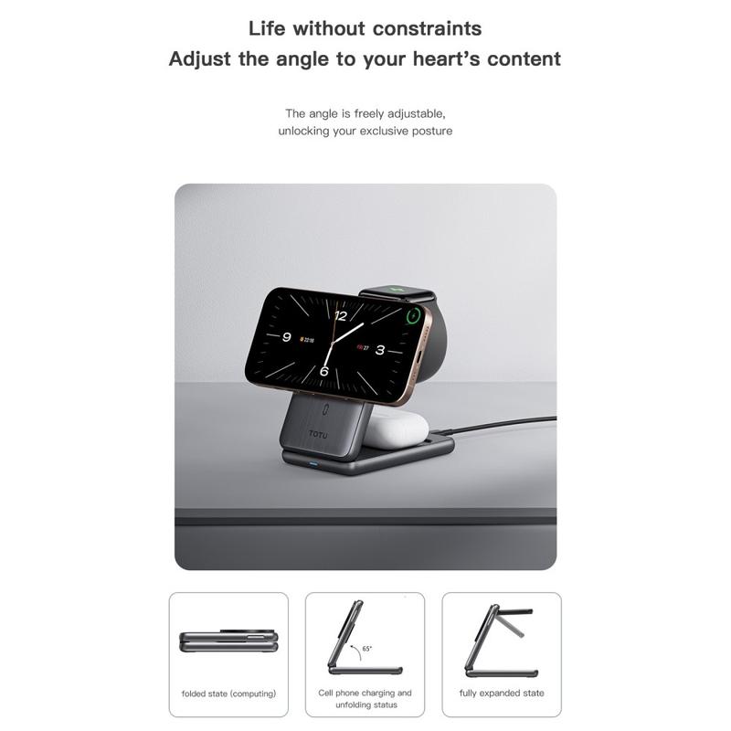 Totu CW-4-W 3-i-1 trådlös laddningsstation - magnetiskt hopfällbart laddningsställ för telefon, klocka och öronsnäckor - 15W snabbladdning