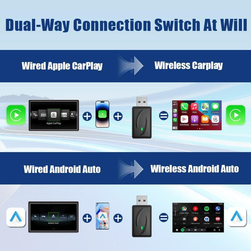 Uppgradera din bil med Wireless CarPlay & Android Auto 2-i-1-adaptern, som förvandlar traditionella kabelanslutningar till sömlösa trådlösa upplevelser. Njut av mer frihet, mindre röran och säkrare körning - allt utan trassliga kablar.