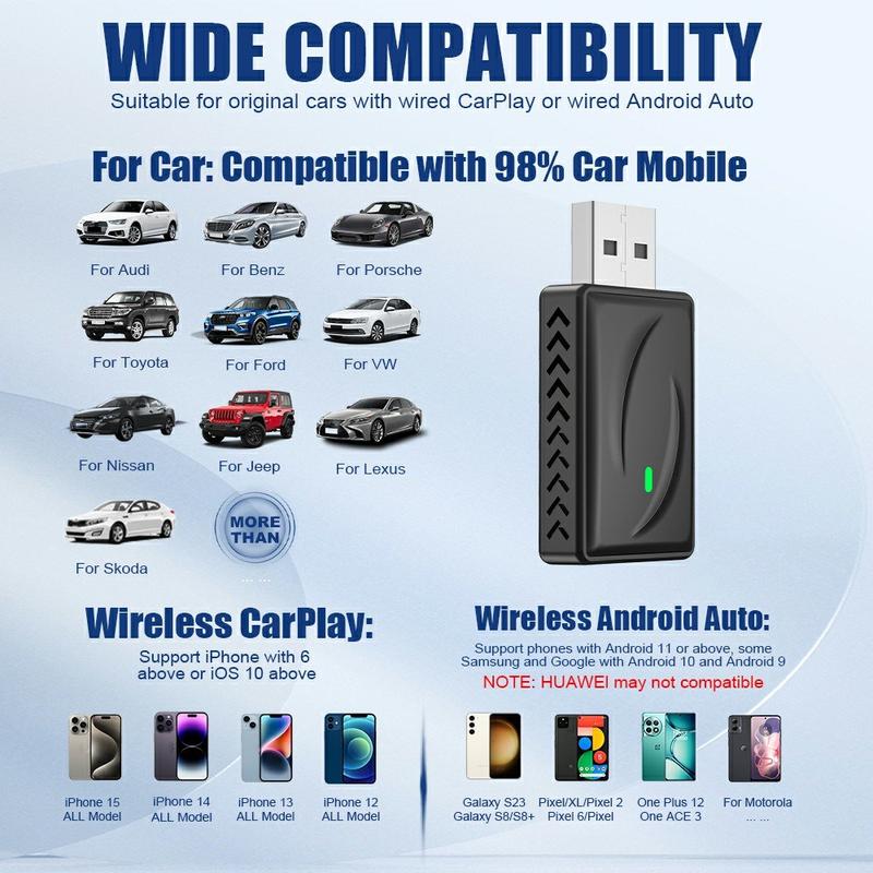 Den här trådlösa 2-i-1-adaptern erbjuder oslagbar bekvämlighet, universell kompatibilitet och kompakt design - allt i en och samma enhet. Det är den perfekta lösningen för förare som vill modernisera sitt fordon utan kostsamma uppgraderingar.
