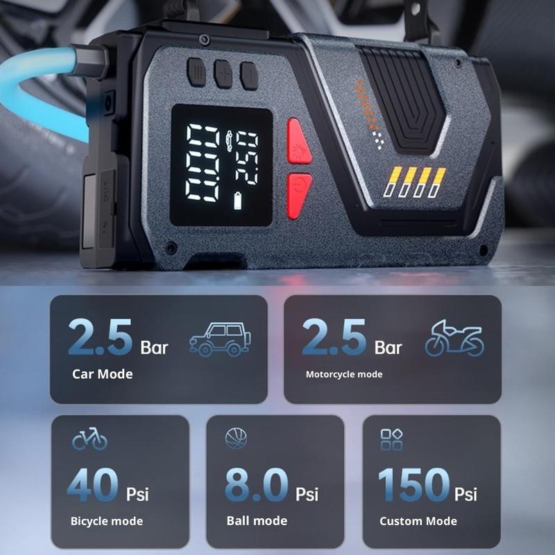 Det inbyggda 6000 mAh-batteriet ger tillräckligt med ström för flera däckuppblåsningar och stödjer nödstarthjälp. Det fungerar också som en strömkälla för laddning av små enheter när det behövs.