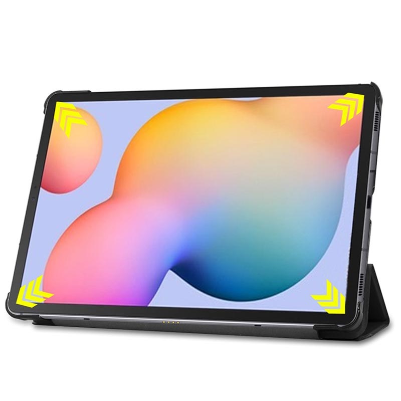 Ett väldigt praktiskt fodral för Samsung Galaxy Tab S6 Lite eftersom det har en vikbar framsida som låter dig placera din surfplatta vid en utmärkt position och förbättrar användningen av din surfplatta. Placera bara din Samsung Galaxy Tab S6 Lite vid en bekväm position och se på filmer eller surfa på webben lättare än någonsin.