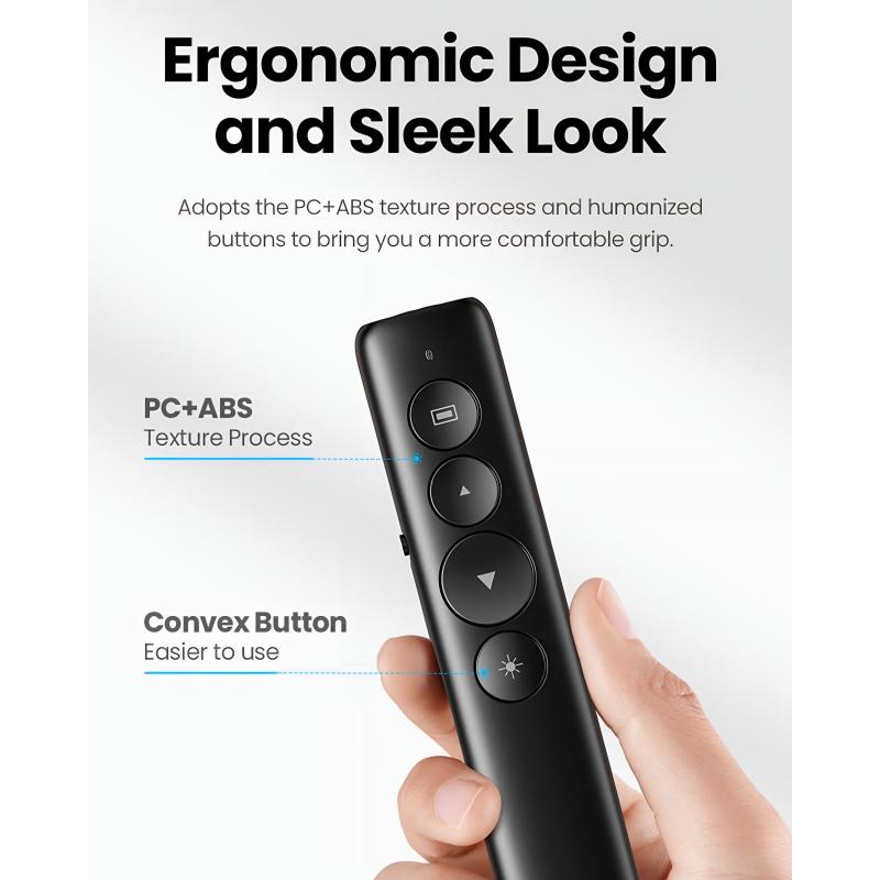 UGREEN Wireless laser pointer presenter LP479 är en pålitlig presentationsfjärrkontroll som är utformad för smidig bildkontroll och tydlig visuell vägledning. Med en lång trådlös räckvidd och en kraftfull laserpekare kan du röra dig fritt samtidigt som du har full kontroll över din presentation. Den lätta, ergonomiska designen och plug-and-play-installationen gör den till ett idealiskt verktyg för affärsmöten, klassrum, konferenser och offentliga tal.