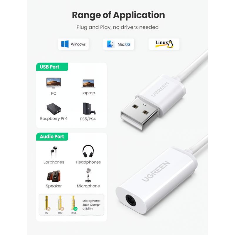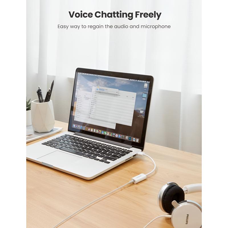 UGREEN US206 USB-ljudadapter lägger till en 3.5mm TRRS-headsetanslutning till enheter som saknar ett dedikerat ljuduttag eller har en skadad port. Den stöder både ljudutgång och mikrofoningång via en enda 3.5mm-kontakt, vilket gör den idealisk för headset, online-möten, spel och daglig kommunikation. Med enkel plug-and-play-funktion och bred systemkompatibilitet erbjuder den en pålitlig och bekväm ljudlösning utan ytterligare drivrutiner.