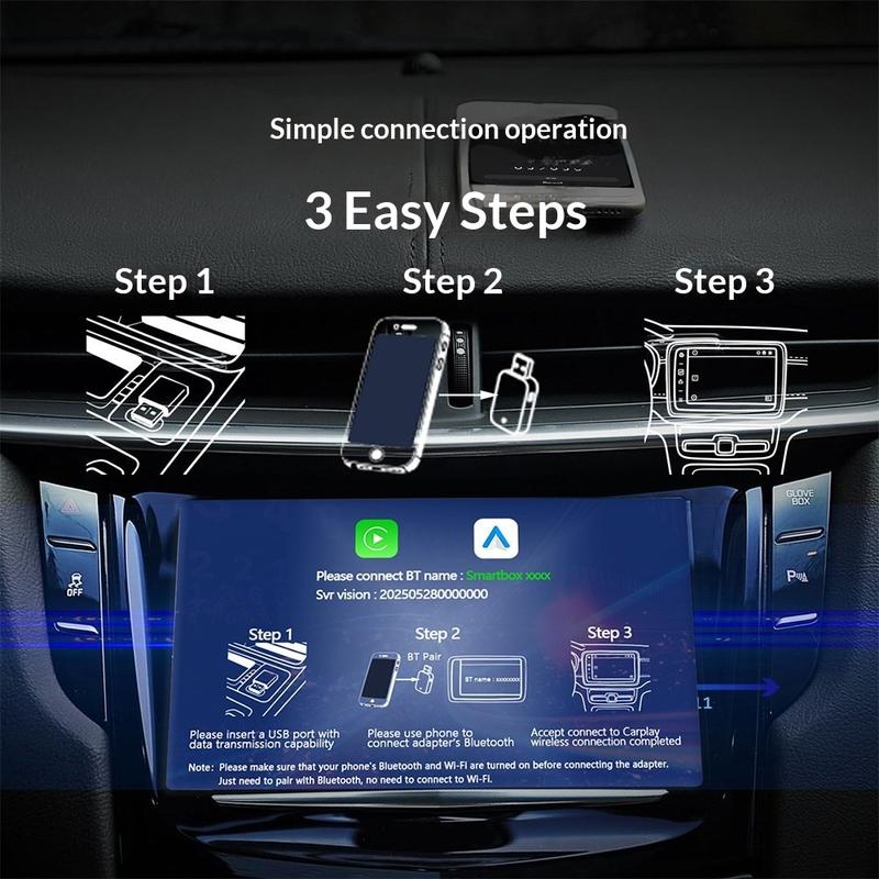 Ultra K15 stöder både iPhone- och Android-enheter inom det angivna kompatibilitetsområdet och använder Bluetooth 5.2 och dual-band WiFi 2,4G/5G för trådlös anslutning. Enligt den medföljande informationen kan parningen av telefonen genomföras i tre steg, och adaptern återansluter automatiskt inom cirka 5-15 sekunder efter att bilen startats. Detta bidrar till en smidigare rutin samtidigt som instrumentpanelen hålls renare och kabeltrasslet minskas.