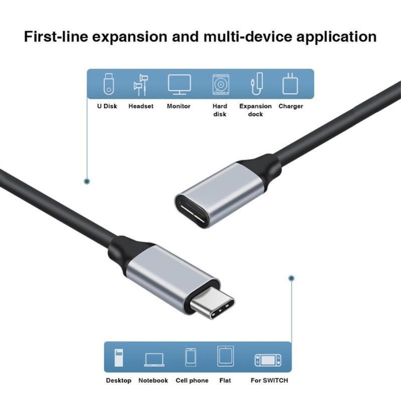 Denna USB-C-förlängningskabel med hane- till honkontakt kombinerar snabb laddning, datasynkronisering och videoöverföring i en kompakt lösning. Perfekt för att förlänga USB-C-portar utan att kompromissa med prestanda eller stabilitet.