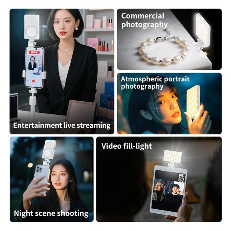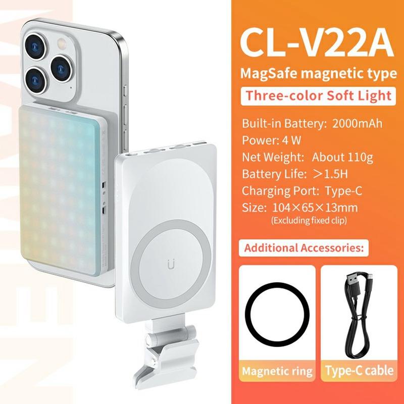 V22A Portable Magnetic LED Fill Light ger kraftfull och exakt belysning i en kompakt design som är idealisk för smartphones, kameror och streaminguppsättningar. Med Type-C-laddning, justerbar ljusstyrka och ett brett färgtemperaturområde garanterar den utmärkta resultat oavsett om du filmar inomhus, utomhus eller på resande fot.