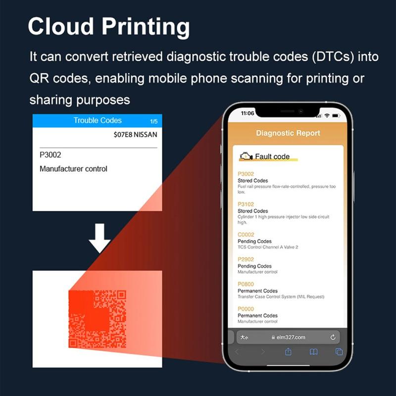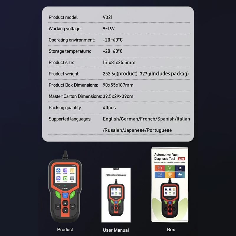 Plugga in, starta och diagnostisera på några minuter. Den handhållna OBD2-skannern V321 ansluts till fordonets diagnosport och visar tydliga felkoder, liveparametrar och batterihälsa på en ljusstark 2.4″ färgskärm (320 × 240). Med stöd för alla centrala OBD II/EOBD-protokoll och ett enkelt plug-and-play-arbetsflöde är den ett perfekt verktyg i handskfacket för snabba kontroller före en resa eller efter en reparation.