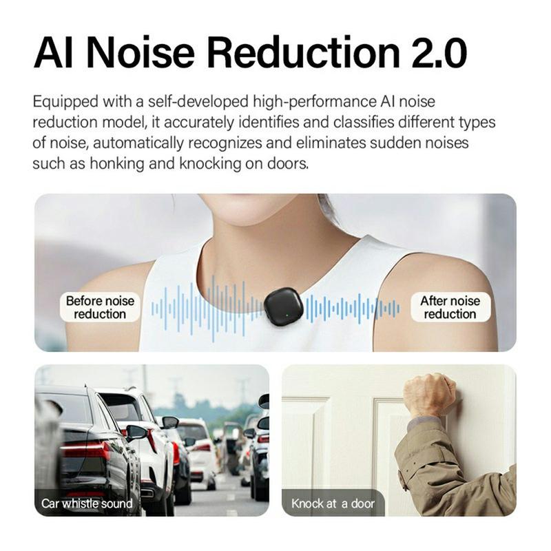V36 Mini Wireless Lavalier Microphone använder avancerad AI-driven brusreducering med tre lägen: High-Fidelity (grönt ljus), AI-brusreducering (standard, gult ljus) och DSP-brusreducering. Detta säkerställer att dina inspelningar är fria från oönskade bakgrundsljud samtidigt som din röst hålls naturlig och tydlig - perfekt för vloggar, intervjuer, livestreams och podcasts.