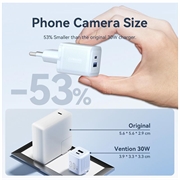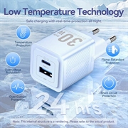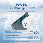 - Utgång med dubbla portar: USB-C (30 W PPS / PD 3.0) och USB-A (30 W QC 4.0 / QC 3.0) för telefoner, surfplattor och öronsnäckor