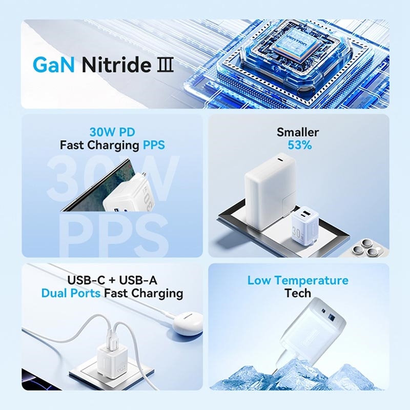 Ladda telefoner, surfplattor och öronsnäckor i toppfart med en kontakt i fickformat. VENTION FEQ GaN-laddaren använder nästa generations galliumnitridkomponenter för att leverera hela 30 W genom antingen USB-C- eller USB-A-porten, samtidigt som den är svalare och mindre än gamla tiders kiselklossar. Stöd för flera protokoll innebär snabb och säker strömförsörjning för allt från iPhone- och Galaxy-telefoner till Nintendo Switch och Bluetooth-högtalare, hemma eller på resan.