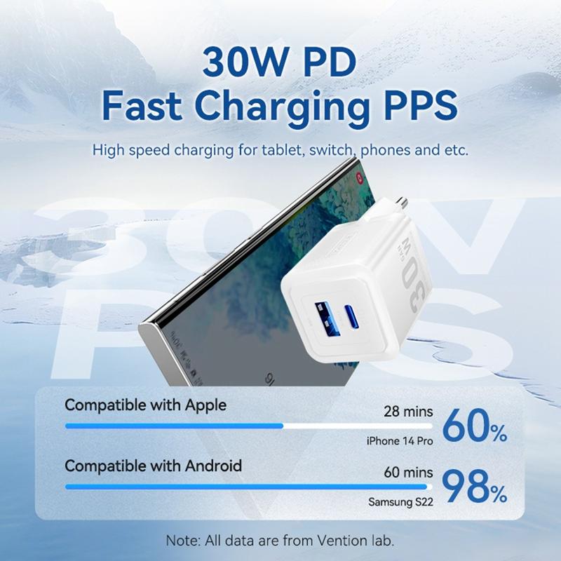 Ladda telefoner, surfplattor och öronsnäckor i toppfart med en kontakt i fickformat. VENTION FEQ GaN-laddaren använder nästa generations galliumnitridkomponenter för att leverera hela 30 W genom antingen USB-C- eller USB-A-porten, samtidigt som den är svalare och mindre än gamla tiders kiselklossar. Stöd för flera protokoll innebär snabb och säker strömförsörjning för allt från iPhone- och Galaxy-telefoner till Nintendo Switch och Bluetooth-högtalare, hemma eller på resan.