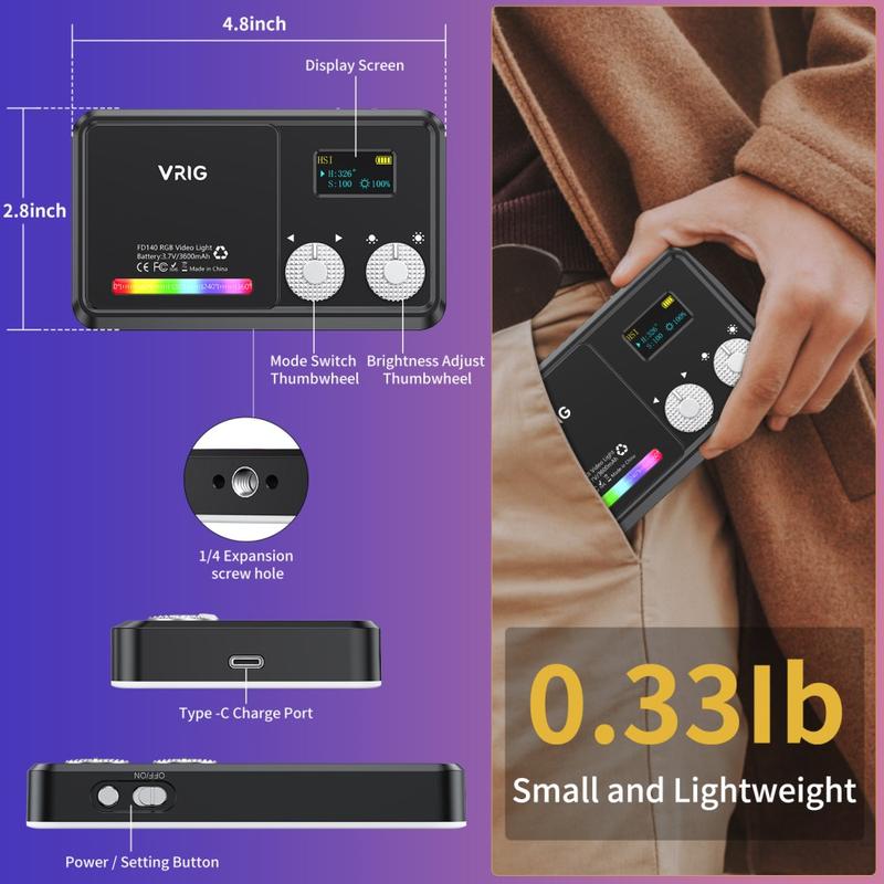 VRIG FD-98 LED Video Light är utformad för kreatörer som behöver belysning av studiokvalitet i en bärbar storlek. Med 98 LED-pärlor med hög CRI ger den en ljus, mjuk och naturlig belysning för fotografering, videografi, innehållsskapande och livestreaming. Oavsett om du är inomhus eller på resande fot ger den här fyllnadslampan i handflatestorlek konsekventa professionella resultat.