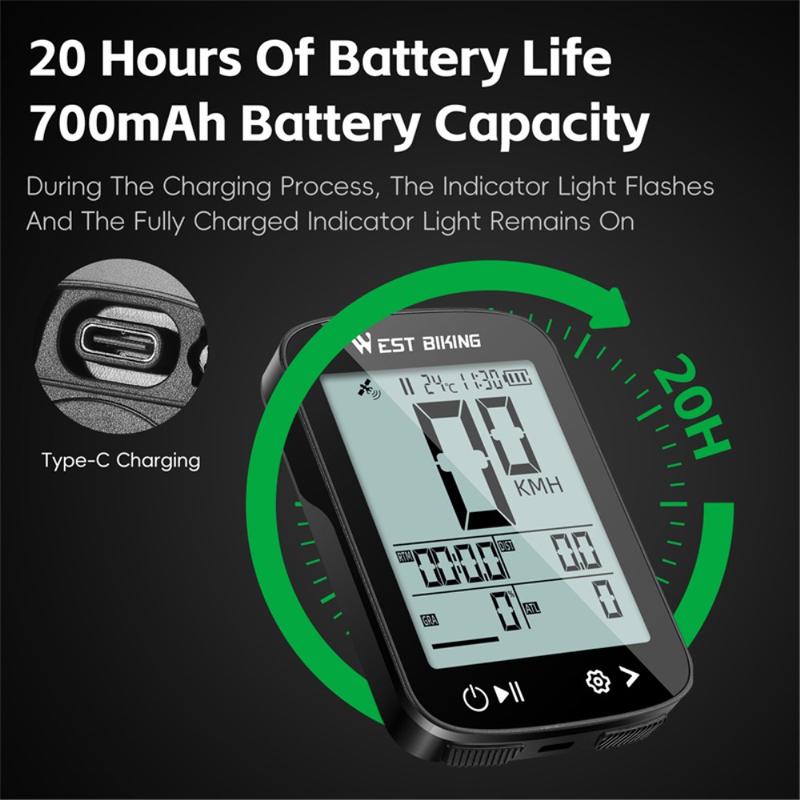 West Biking YP0702113 GPS-cykeldator - 2,4-tums antireflexskärm, 5-systempositionering, IPX7-vattentät, 20 timmars batteritid, CE-certifierad