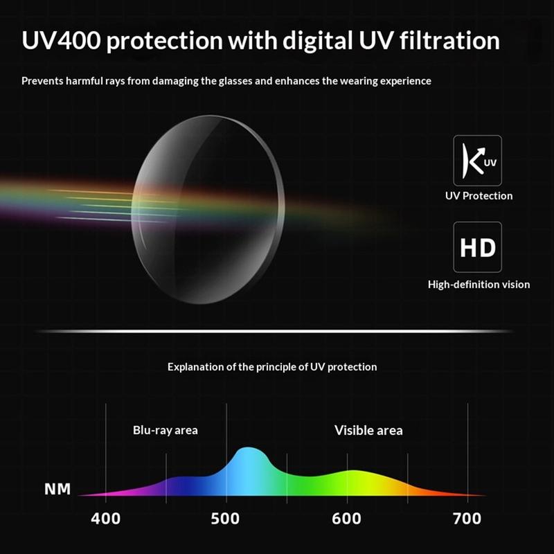 - UV400-belagda PC-glasögon hjälper till att blockera UVA/UVB och minskar bländning i starkt ljus