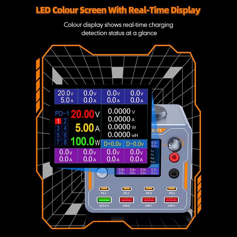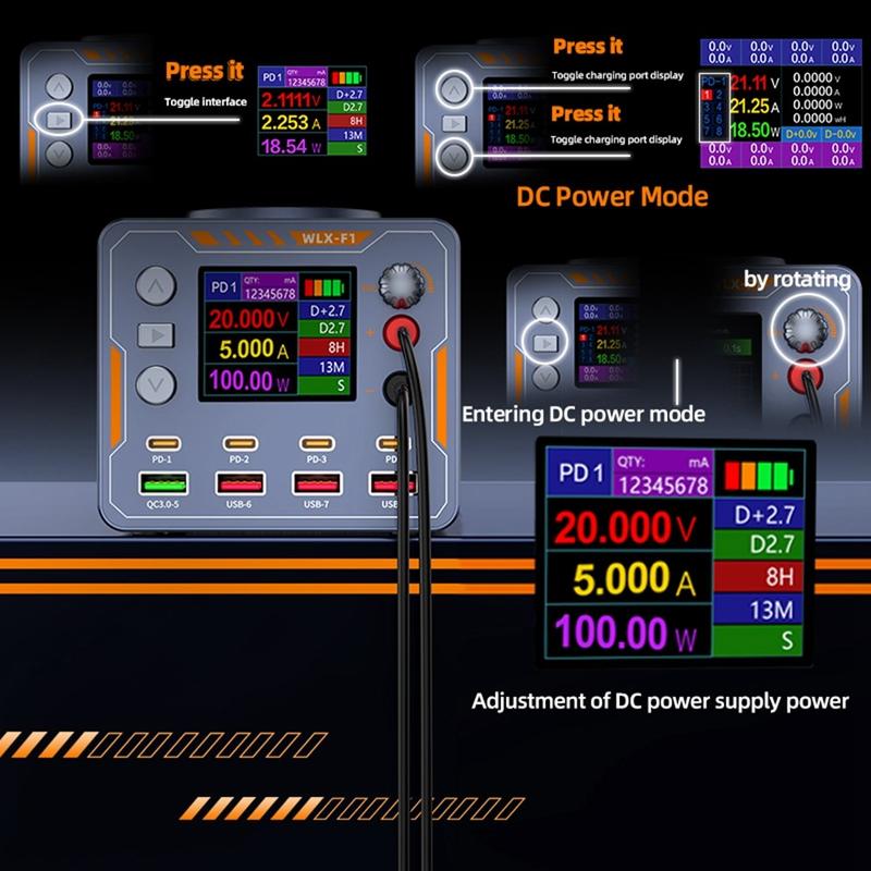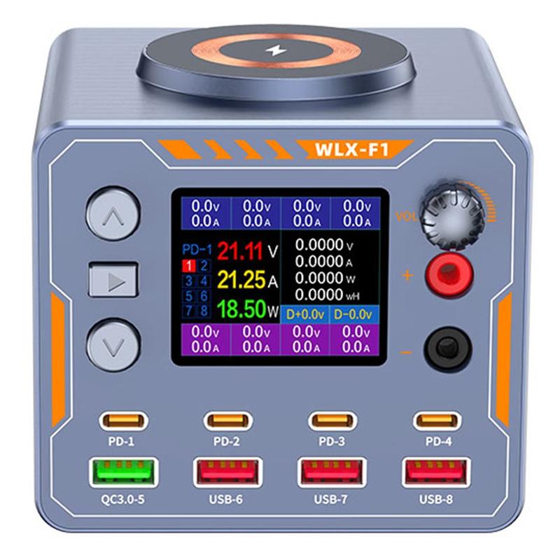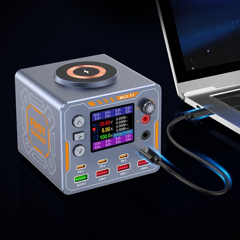 Med en uteffekt på upp till 100 W för en enda port driver WLX-F1 effektivt enheter med hög efterfrågan, t.ex. MacBooks och bärbara USB-C-datorer. Den har också en justerbar DC-utgång med precision (1,8-12 V, 2A), vilket gör den idealisk för testning, reparation och diagnos av elektronisk utrustning.