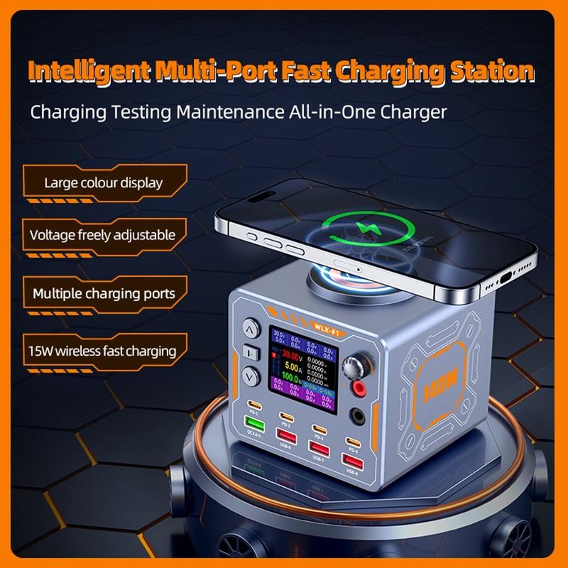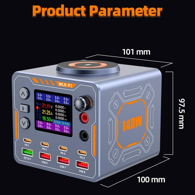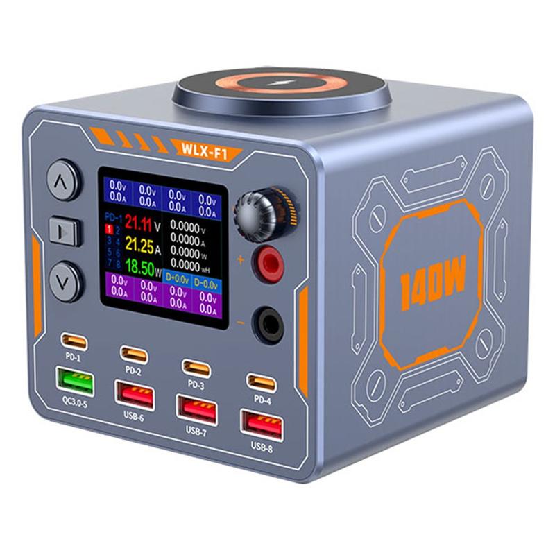 Den fantastiska WLX-F1 140W laddningsstationen för flera enheter är en kraftfull och mångsidig skrivbordsladdare som är utformad för bärbara datorer, telefoner, surfplattor, wearables och till och med elektronikreparation. Utrustad med 8 laddningsalternativ, inklusive fyra PD-snabbladdningsportar, en QC3.0-port, tre USB-portar och en 15 W trådlös laddningsplatta, ger den en komplett laddningslösning för hem-, kontors- eller verkstadsmiljöer.