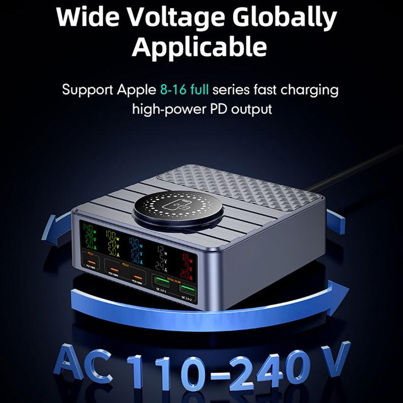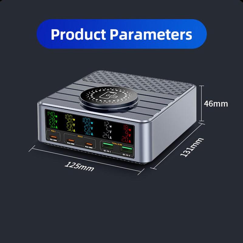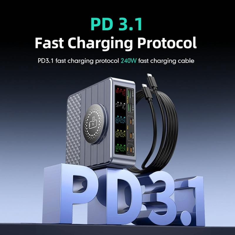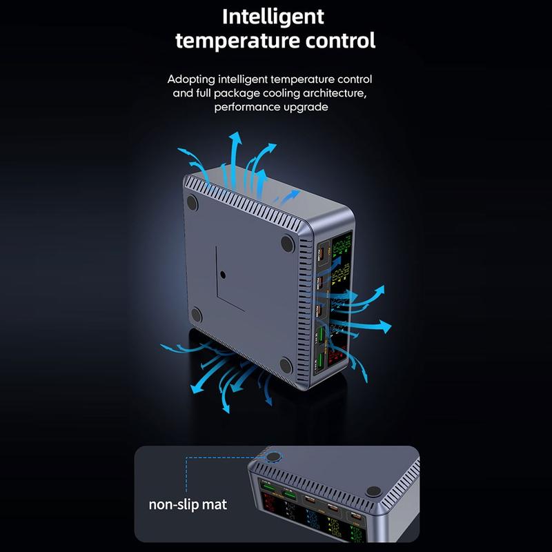 Den inbyggda digitala displayen ger realtidsinformation om laddningseffekt och portstatus, vilket gör det enkelt att övervaka strömfördelningen. Med 9-lagers säkerhetsskydd garanterar laddaren säker och stabil drift för all ansluten elektronik.
