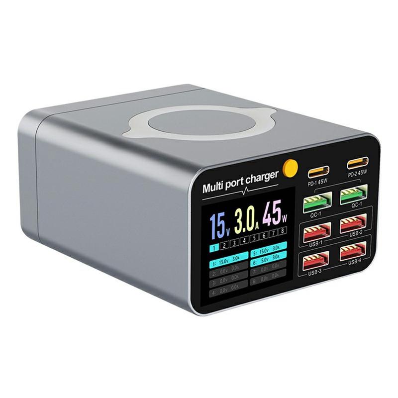WLX-M2 80W laddningsstation för skrivbord - 8-portars GaN-snabbladdare med USB-C PD och trådlös laddning (EU-kontakt)