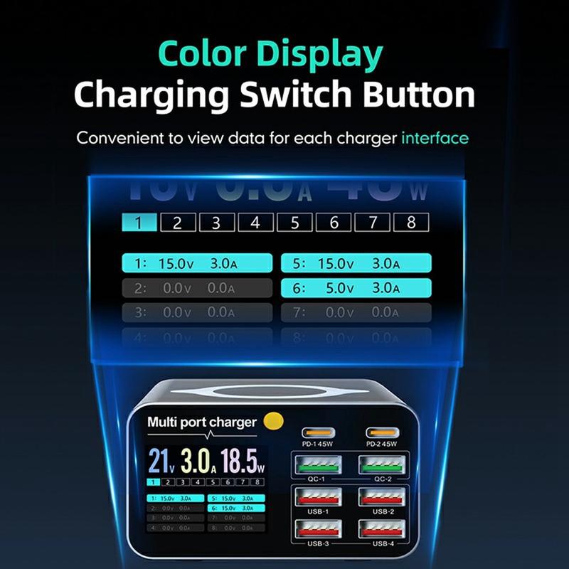 - 8-portars design: 2 × USB-C PD, 2 × QC, 4 × USB